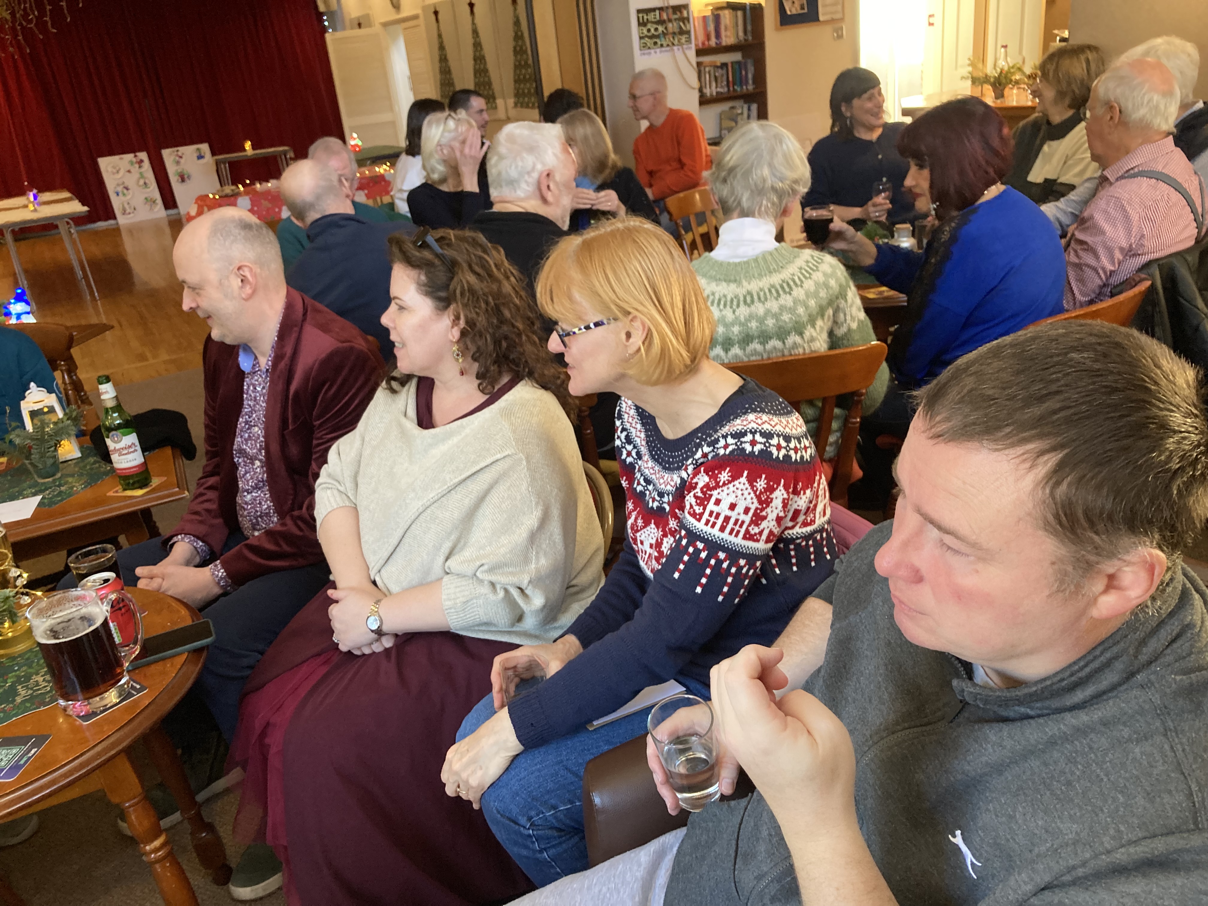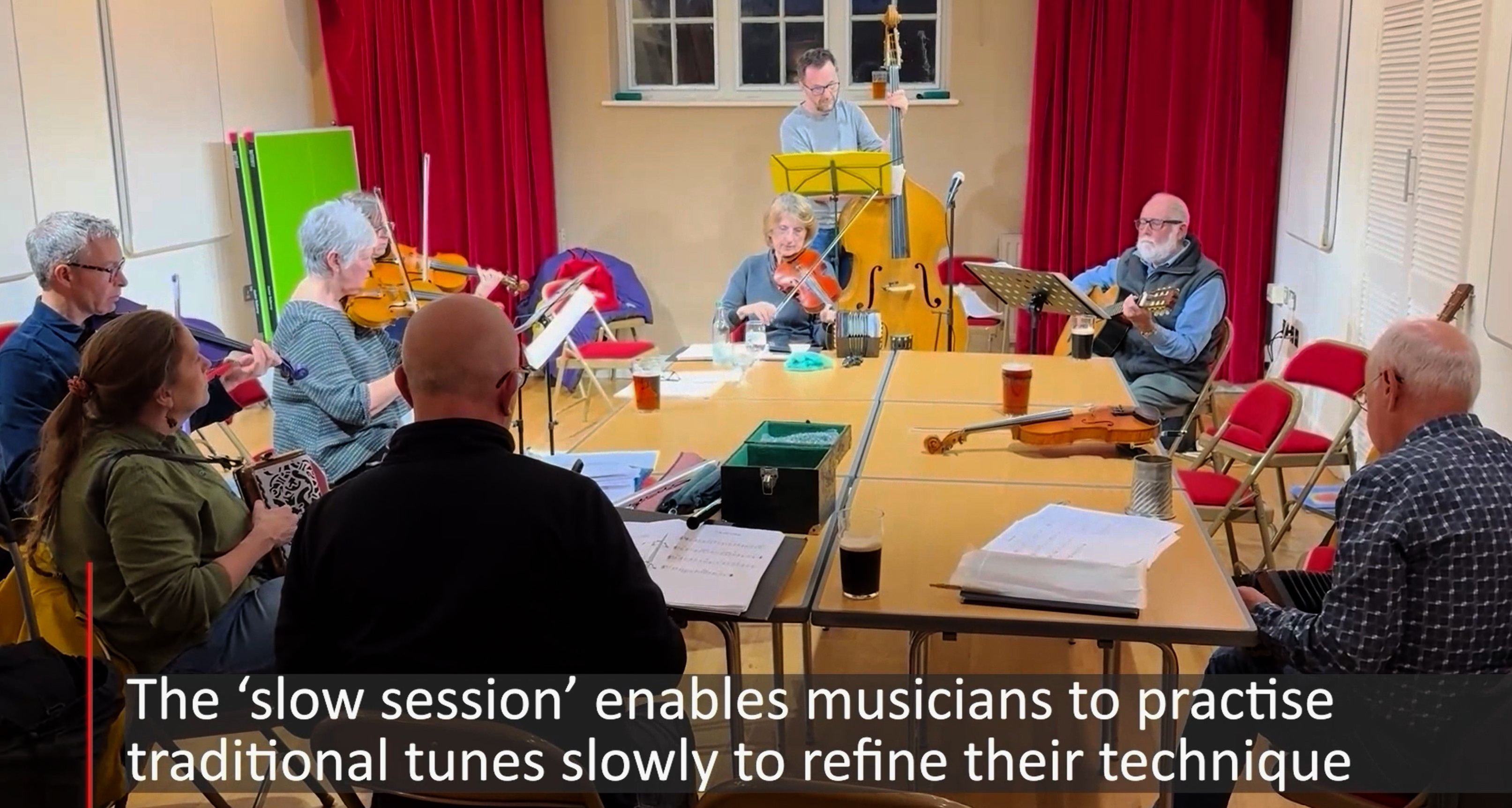 In 2025, we met in January, March, April, May, July, October and December. Each session was attended by between 10 and 18 players on a range of instruments, including fiddles, guitars, whistles, concertinas, melodeons, mandolins, mandola, bouzouki, double bass, bodhrán and uilleann pipes. Our list of tunes grew from 30 in January 2025 to 39 by December and we’ll be starting 2026 with over 40, covering most types of traditional tune: reels, jigs, slip jigs, slides, polkas, marches, waltzes and flings. After the Slow session finishes around 9pm, the evening continues with a ‘slightly faster session’ with songs interspersed. The Slow session grew from strength to strength in 2025 and has become a regular fixture at The Club, attracting both musicians and a number of faithful listeners.